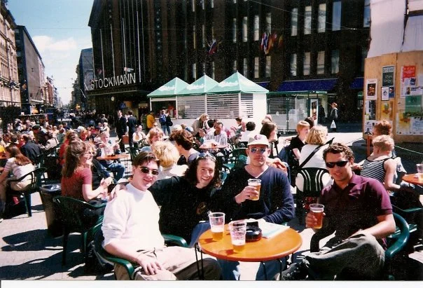 (l-r) Jim, me, Mick and Michael, two Australian maniacs, banishing our hangovers with warm sunshine and cold Finnish beer
